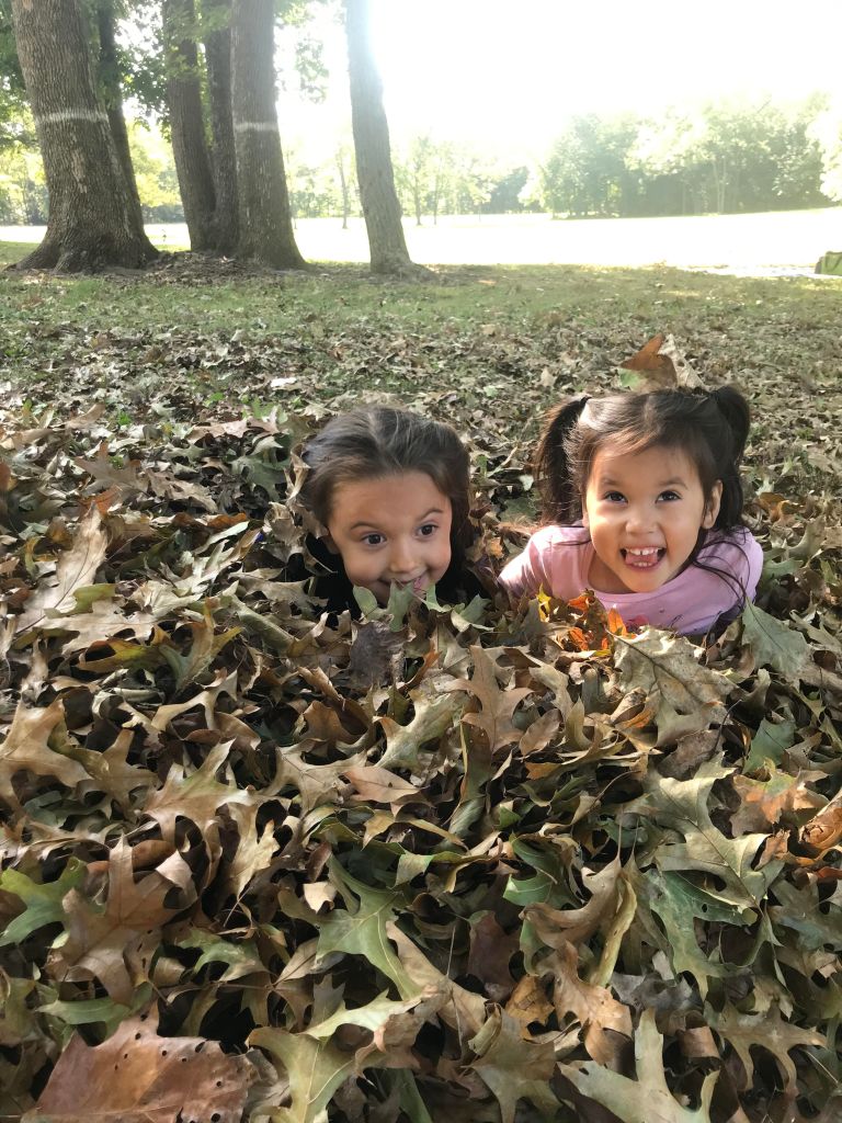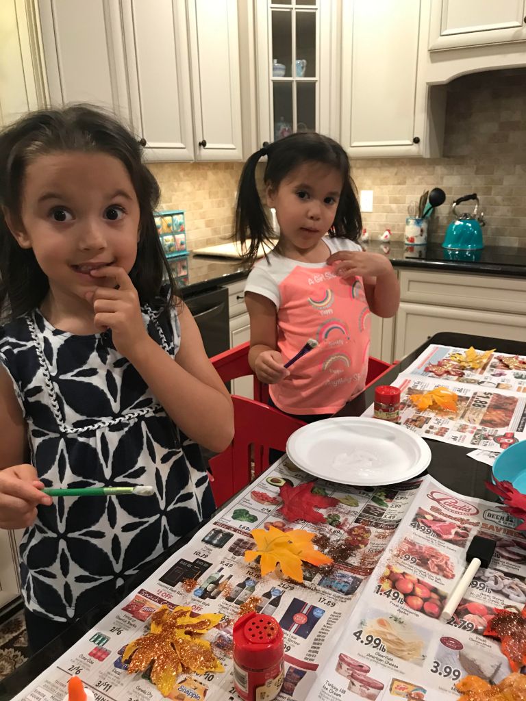 Feeling deprived of traditional kindergarten crafts in my own childhood, I just couldn’t keep myself from trying leaf prints with the girls. I admit the result was not quite so artistic as Pinterest led me to envision, but the prints worked well enough for our Thanksgiving tree, where we wrote our thanks individually for each of our ten billion stuffed animals. (My lofty ideals are always humbled with a generous dose of reality around here!)