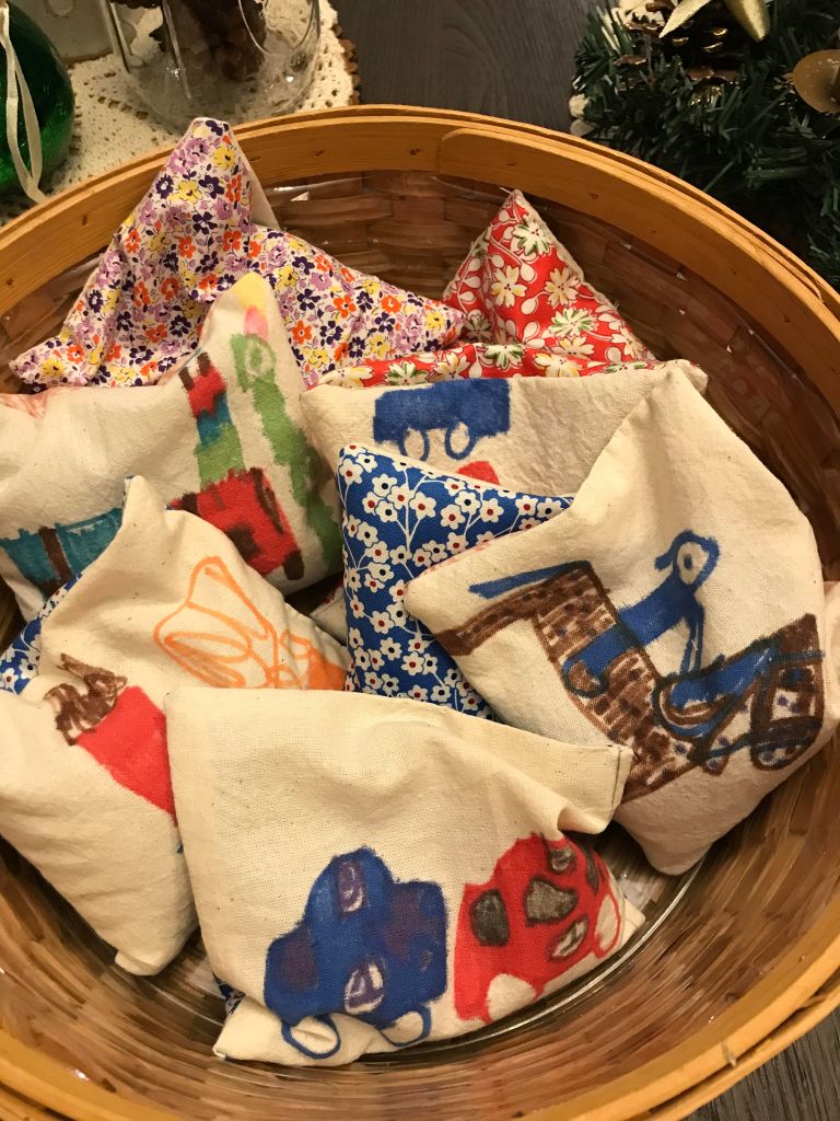 I always try to find a couple of crafts that we can give as gifts in the elusive effort to make Christmas more about giving than getting. We made lavender sachets this year. The girls drew on muslin with fabric markers, I sewed them into pouches, and then we filled them with one part dried lavender and two parts uncooked rice. They also make excellent bean bags for the younger set!