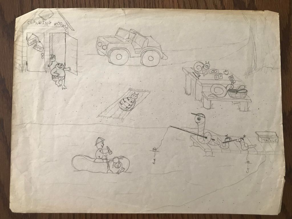 As a counterbalance to my frayed emotions, my big sister adopted a “since we can’t beat ’em, let’s join ’em” attitude. If we were to be surrounded by insects, why not have some fun with them? “Let’s draw a picture of a bug picnic,” she snickered, and so we did. We became so engrossed in our project that I forgot my woes. Here’s my sister’s drawing, treasured over the years: