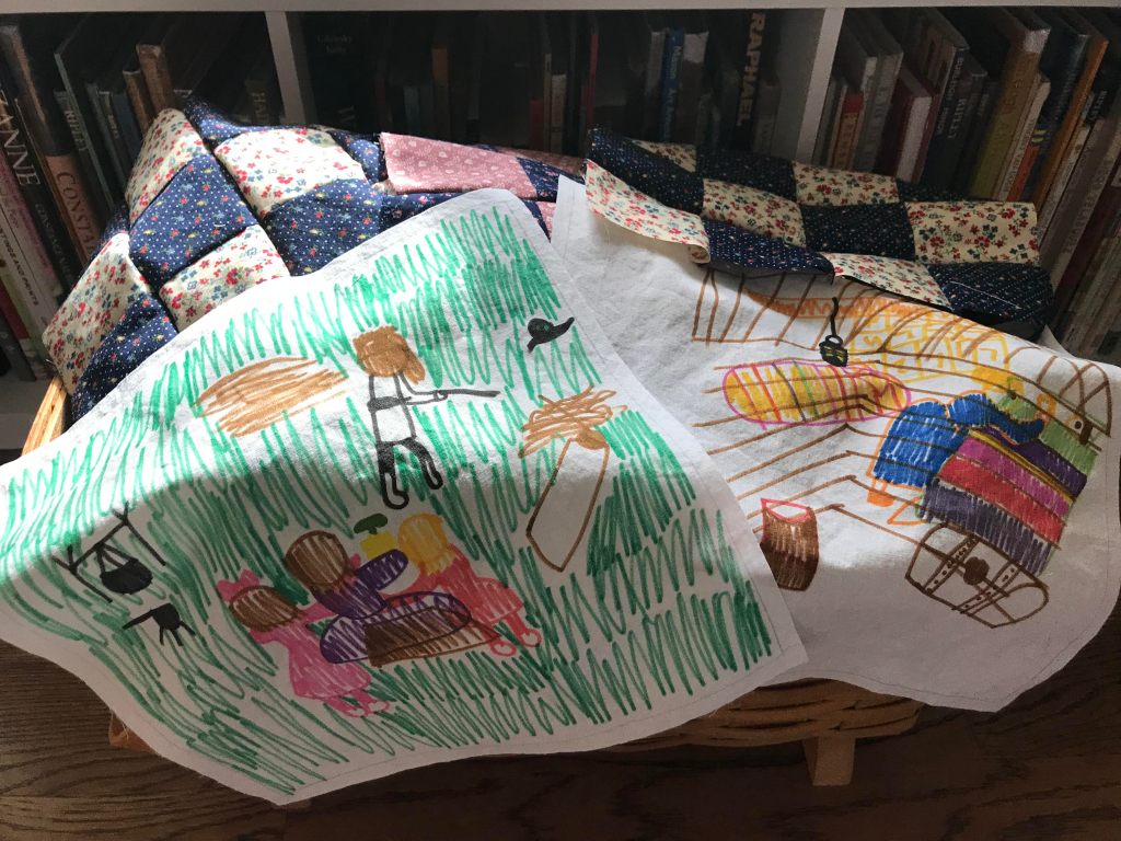 Out came the fabric markers and muslin squares so the girls could draw their favorite scenes from Little House on the Prairie. I found nicely coordinated calicoes at my beloved thrift store for patchwork blocks to complement their drawings. My plan is for each girl to have a lap-size quilt when we’re finished. Don’t you think this is an ingeniously sneaky way to give the girls narration practice as they tell family members about their drawings?