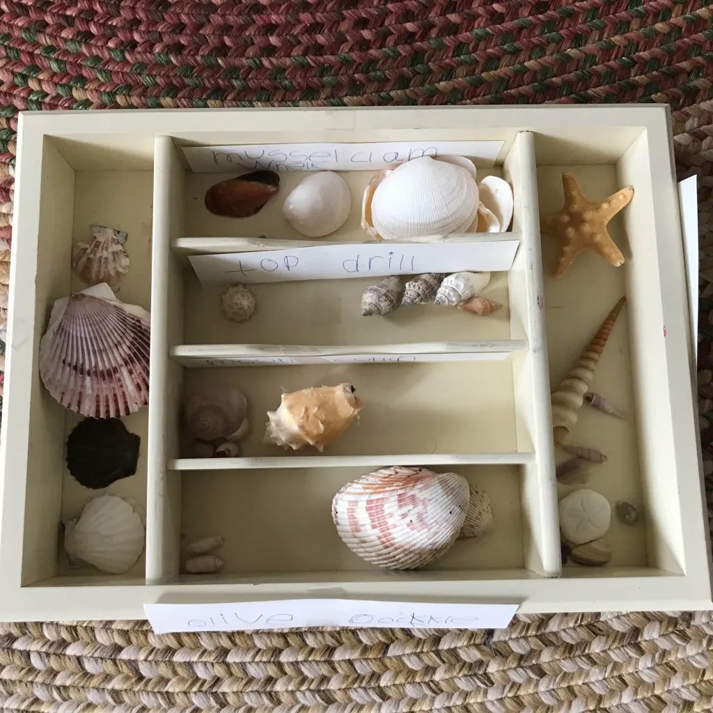 First, I dragged bags and bags of seashells home from the thrift store, plus handy cutlery trays, etc, to sort them in. Then we identified our shells with help from Houses from the Sea and Seashells by the Seashore. We made a game of closing our eyes and identifying the shells by touch.